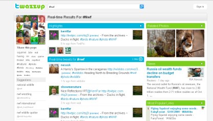 Twazzup: This tool is more visual and helps me see the wildlife sightings in greater detail (it allows me to see twitpics and photos). It also links off to recent articles where NWF is mentioned. Overall– it’s a great visual representation of what #NWF is doing and even shows the large number of contributors over time (it tracks for more than a week– unlike WThashtag).