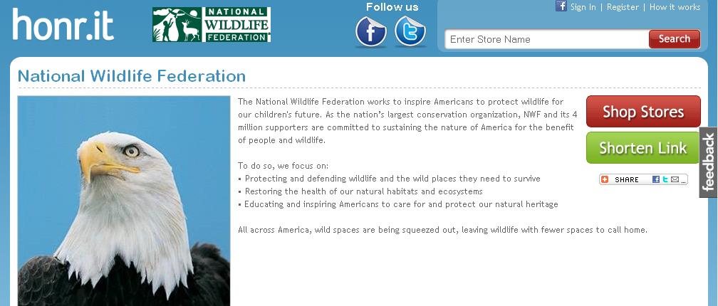 4) Use a URL Shortener: Through a service called edeems, you can now shop or shorten a link all while helping the oil spill work we’re doing. Go to http://nwf.honr.it/ . Whether your just looking to browse items or you’re looking to shorten a link you’re about to tweet…these are two clever and painless ways to help wildlife.